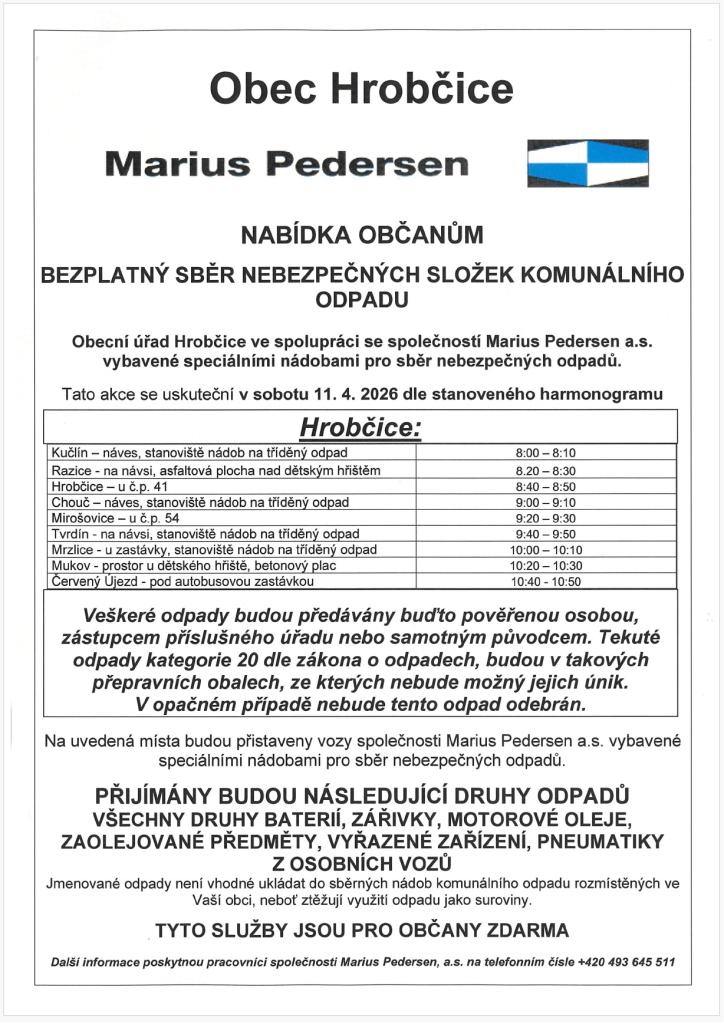 Sběr nebezpečných složek komunálního odpadu v sobotu 11.04.2026 viz plakát